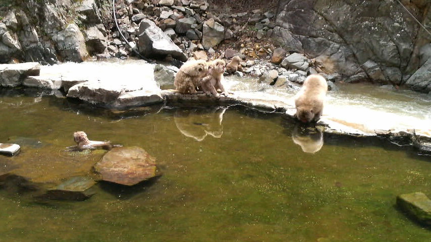 志賀高原で春スキーを楽しむ人たちを横目に、さらに下り、サルがいる露天風呂で有名な『地獄谷野猿公苑』へ。ココのサルは人に近寄ってくるなんてことは無く、お互い遠巻きに探り合う(笑)感じ。日光なんかよりずーっとマナーのいいお猿さんでした。…が、子供たちが私以上に怖がり(特にチビ1号は顔が真っ青)、ものの数十分で公苑をでて、車に帰ってきました。